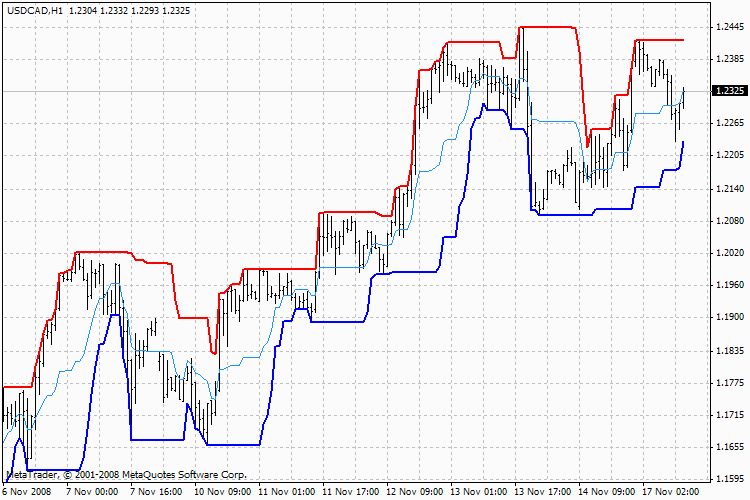 Ценовой канал обрисован двумя разноцветными линиями. Ценовой канал строится за счет вычисления и расчетов наибольших и наименьших цен за определенное количество периодов. Структура построения линий - формулирована