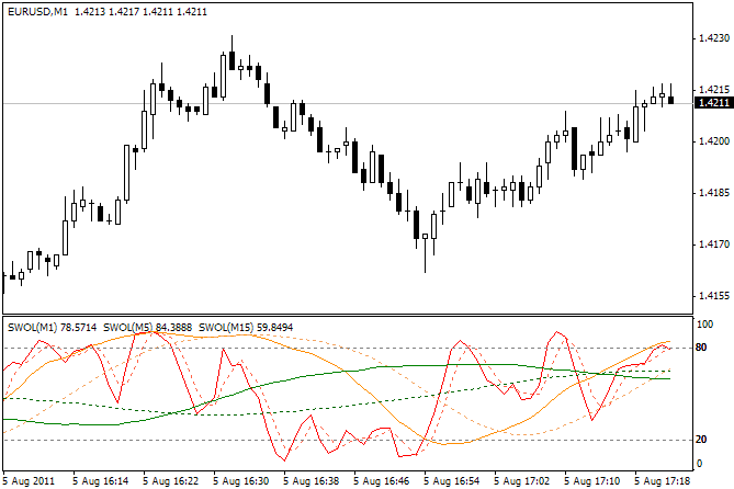 А если индикаторы с совершенно разными ТФ разместить в одно подокно, то увидите все стохастики одновременно.